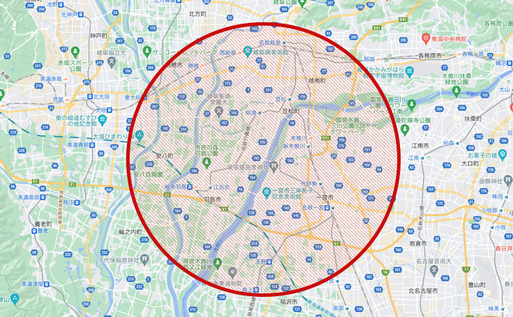 羽島市は川に挟まれているため、10kmの円で表示しています。
